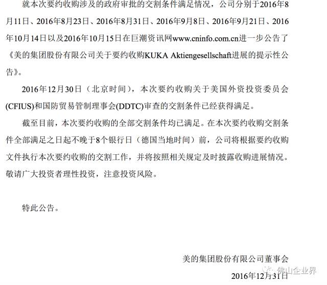美的对德国库卡要约收购闯过最后一关,历时8个月的跨国并购2017年1月完成!12月30日 ,美的集团(“美的”,SZSE.000333)透过MECCA International (BVI) Limited就全球领先智能自动化解决方案供应商德国库卡集团(“库卡”)股份发出的要约收购已获得所有相关监管部门的批准。交割将于2017年1月上旬完成。